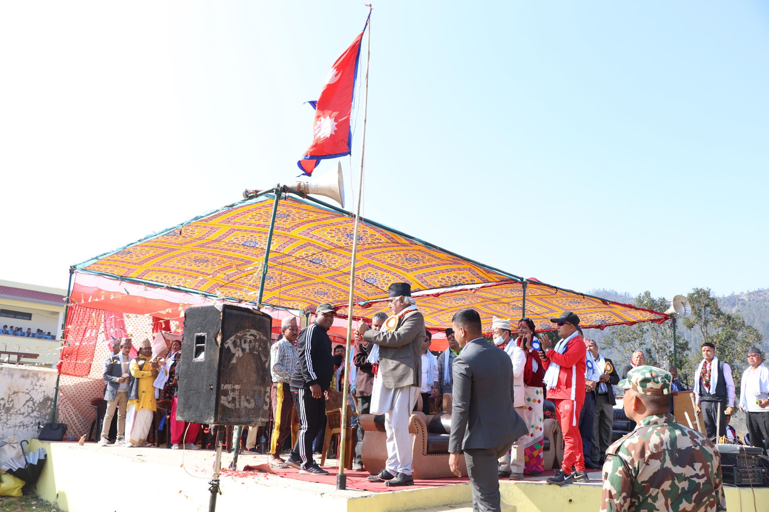 बुलिङटारको त्रिभुवन माविमा आयोजित राष्ट्रपति रनिङ सिल्ड प्रतियोगिता छनोटको उद्घाटन अघि झन्डोत्तोलन गर्दै गण्डकीका मुख्यमन्त्री कृष्णचन्द्र नेपाली पोखरेल ।