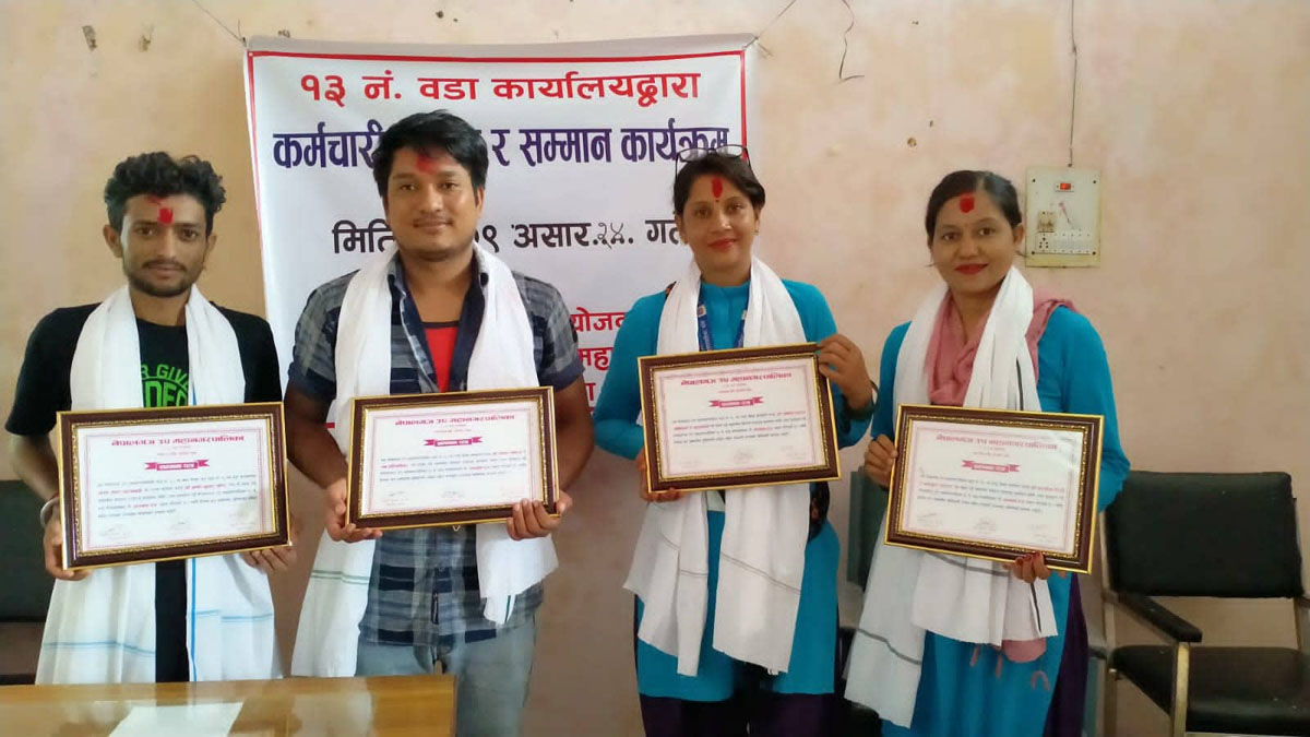 उदयपुर स्थित १३ नम्बर वडा कार्यालयमा रहेका कर्मचारीमध्ये उत्कृष्ट सेवा प्रदान गरेको र कार्यालयको गरिमा उच्च राख्ने गरि जनप्रतिनिधिलाई सहयोग गरेको मुल्याङ्कनका आधारमा कार्यालयले सम्मान गरेको हो ।