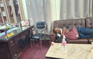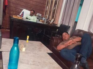 फोटोमा उपमेयर राई कार्यकक्षको आफ्नो कुर्सीमा बसेर मोवाइल चलाइरहेको देखिन्छ भने रानामगर शोफामा निदाएको जस्तो देखिन्छ ।