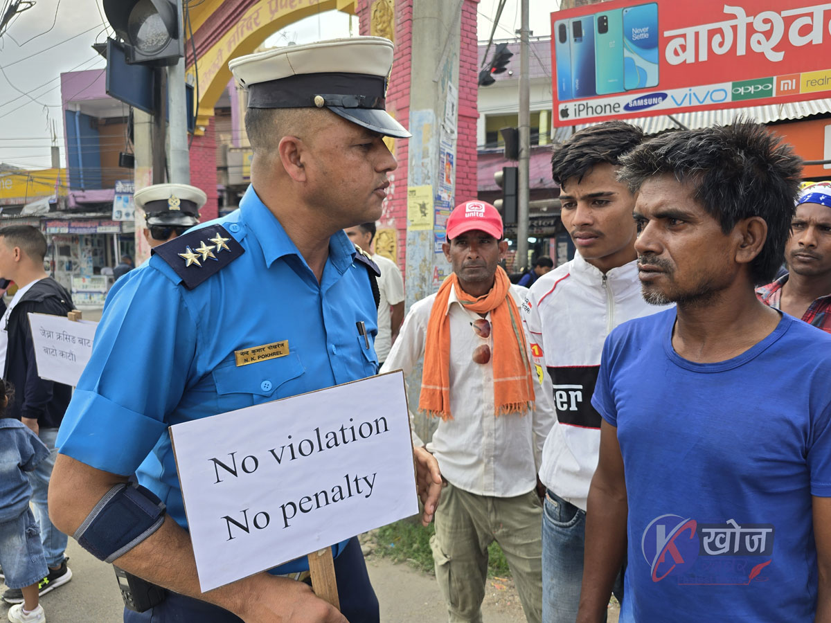 ट्राफिक प्रहरी पोष्ट नेपालगन्जले शुक्रवार नेपालगन्जको धम्बोझिमा सचेतना कार्यक्रम गरेको छ । ट्राफिक नियम लेखेको प्ले कार्ड सहित ट्राफिक लाइटको पालना, जेब्राक्रसिङ्ग गर्ने तरिकाको बारेमा जानकारी गराइएको ट्राफिक प्रहरी पोष्ट नेपालगन्जका इन्चार्ज प्रहरी वरिष्ठ नायब निरीक्षक नन्दकुमार पोखरेलले जानकारी दिए ।