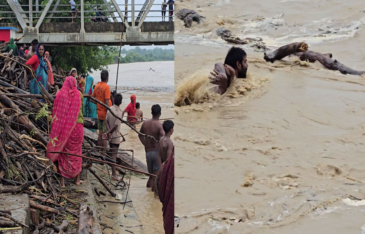 वर्षाका कारण बाँकेको डुडुवा गाउँपालिका–४ सिधनिया घाटस्थित राप्ती नदीमा पानीको बहाव बढ्दै गइरहेको छ, तर स्थानीयलाई त्यसको प्रवाह छैन । पानीसँगै बगेर आएका दाउरा जम्मा गर्न राप्ती नदी किनारमा स्थानीयको भीड लागेको छ । स्थानीय ज्यानको जोखिम राखेर नदीमा पौडी खेलेरै दाउरा सङ्कलन गरिरहेका छन् ।