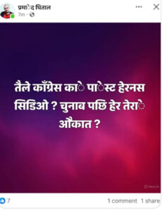 निर्वाचन आचारसंहिता लागू भइसकेको अवस्थामा धितालले फेसबुकमार्फत सिडिओ तामाङलाई लक्षित गर्दै अपमानजनक टिप्पणी सार्वजनिक गरेका थिए। सामाजिक सञ्जालमा उनले लेखेका थिए, “तैले कांग्रेसको पोस्ट हेर न सिडिओ ? चुनावपछि हेर तेरो औकात।”